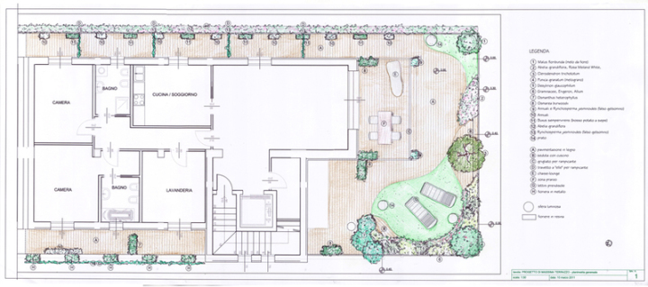 Il progetto BASE è costituito dalla Planimetria di Progetto, in scala 1:50/1:200 o più (a seconda della dimensione del giardino o del terrazzo) dipinta a mano con pastelli. Vi sono evidenziati: i caratteri tipici del progetto, la distribuzione interna dell’area, le aree funzionali, il posizionamento degli apparecchi illuminanti e la legenda delle piante e dei materiali usati.